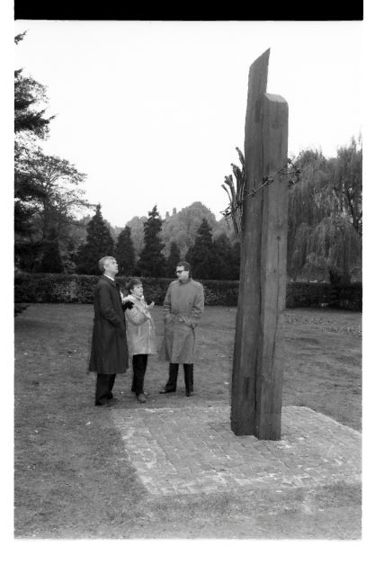 Die Bürgermeister Niels Gormsen (links) und Wolfgang Pföhler mit der Künstlerin Maritta Kaltenborn bei der Enthüllung des von ihr gestalteten Mahnmals an der „KZ-Gedenkstätte“, 1984.