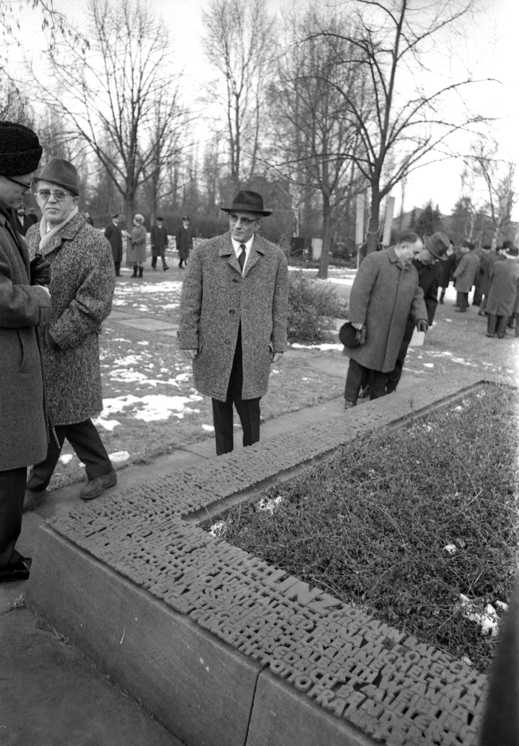 Blick auf den Grabhügel mit dem Sandsteinsockel und dem Bronze-Schriftgitter bei der Ansprache von Oberbürgermeister Hans Reschke, 1970.